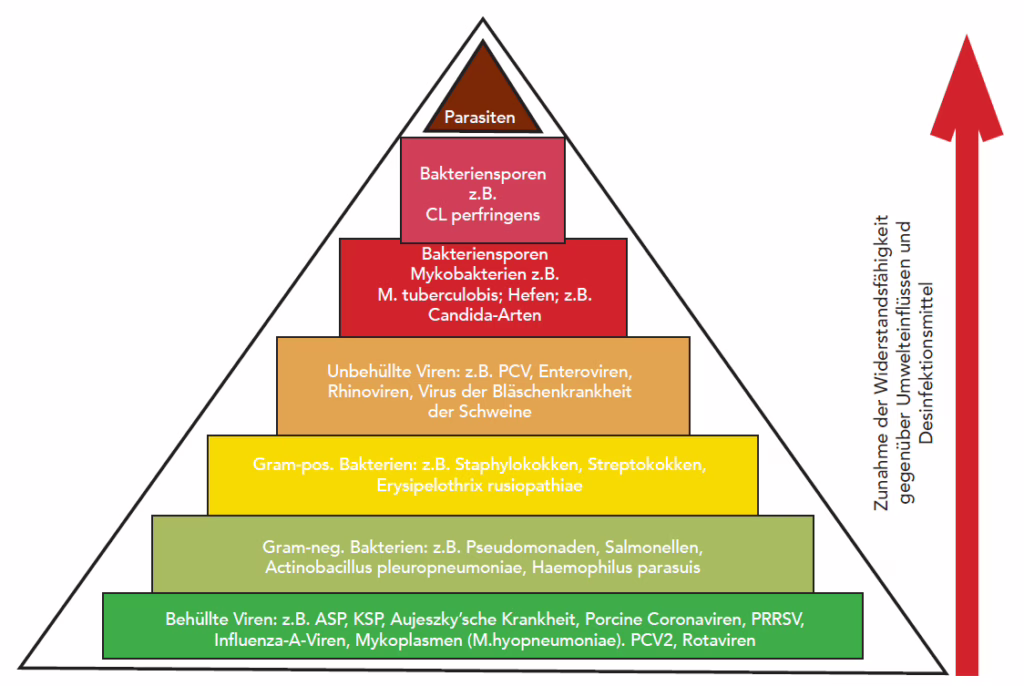 Am wenigsten widerstandsfähig sind sogenannte behüllte Viren (z.B. Schweinepest; Influenza Viren) und Mykoplasmen. Die höchst Widerstandsfähigkeit besitzen Einzeller und Parasiten wie z.B. Kryptosporidien und Kokzidien. Für das individuelle Umfeld und die darin vorkommenden Krankheitskeime muss also jenes Desinfektionsmittel ausgewählt werden, welches über ein passendes Wirkspektrum zur Inaktivierung dieser Keime verfügt.