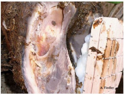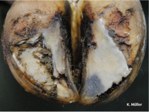 In Folge einer Klauenrehe wird minderwertiges Horn gebildet, da die Lederhaut nicht ausreichend durchblutet wird.